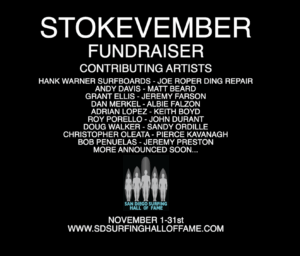 In addition, The San Diego Surfing Hall of Fame STOKEVEMBER wants to raise funds but also wants to stoke out all contributors so I reached out to a bunch of my favorite artists and they came together to support our cause. We are offering limited raffle tickets at increments of $50 with the goal of having you become a founding supporter of the San Diego Surfing Hall of Fame with the purchase of three tickets. Supporter packages run from $150-$1000. As an added bonus, we are gifting an artwork a day for contributors. The value ranges from $35-$250. Mine is the $35 one but its pretty good. We thank all of our art contributors.